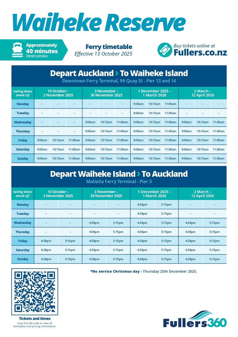 From Monday 20 October 2025, Fullers360 is pleased to be once again making the transition to our summer timetable for Waiheke Island, and to be reinstating our Waiheke Reserve Service.