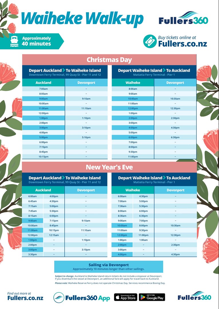 There are some timetable adjustments which impact the Waiheke Walk-up ferry service. On Christmas Day, hourly sailings will run throughout the day from 7am-6pm ex Auckland and from 8am-8pm ex Waiheke with frequency reducing into the evening after these key travel times.